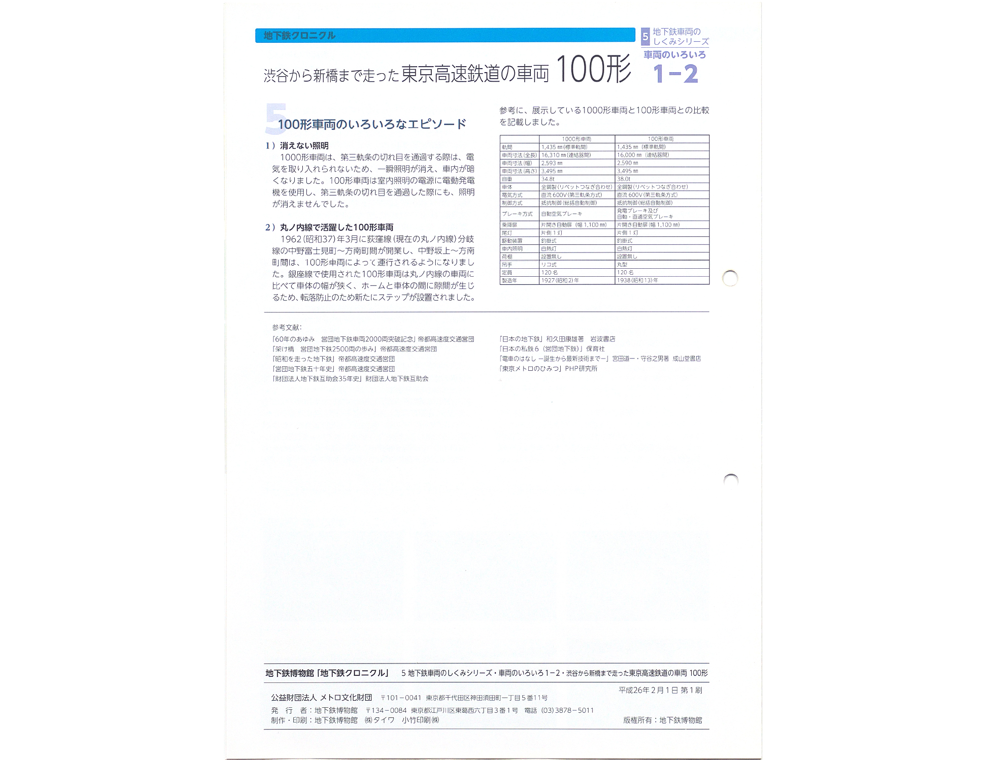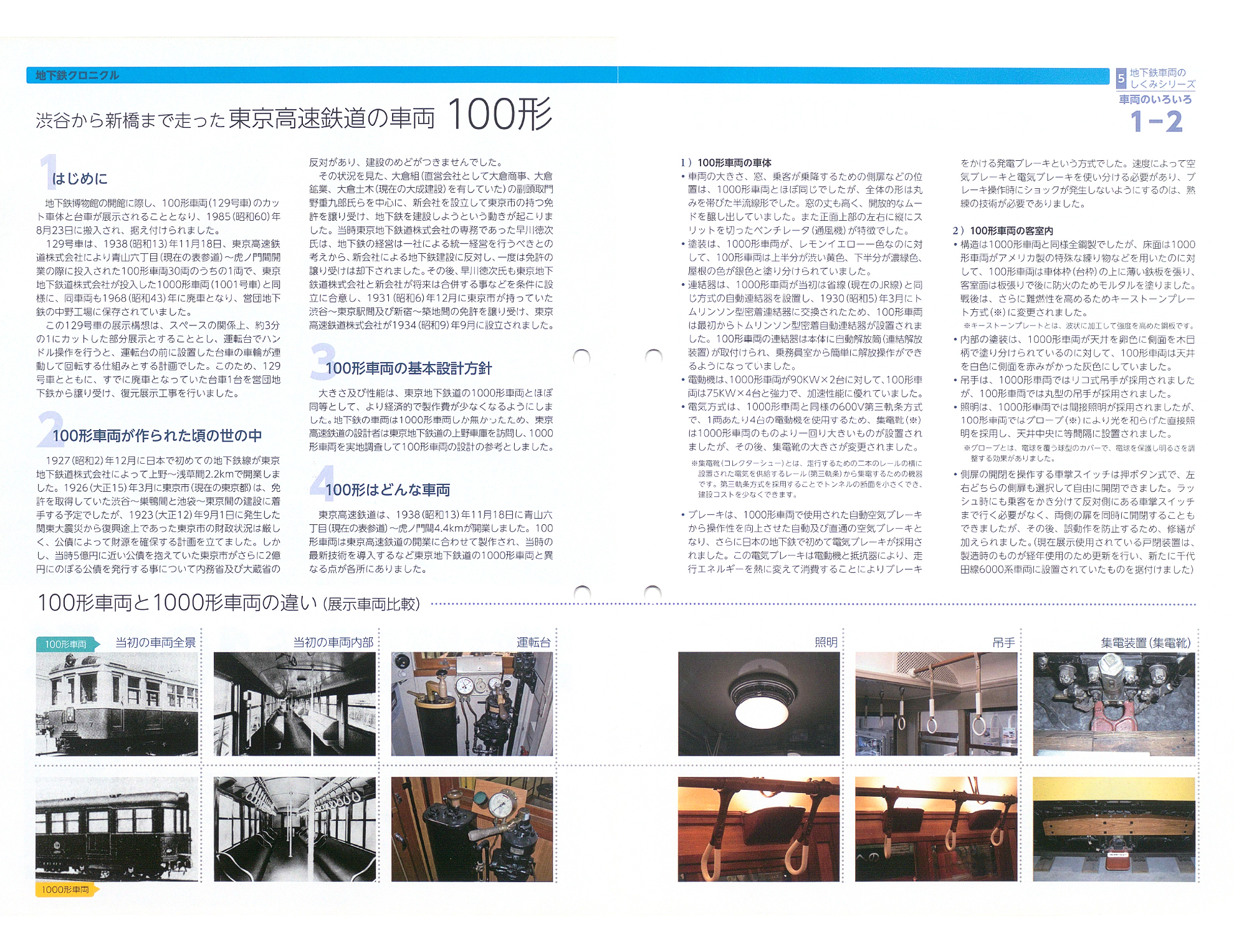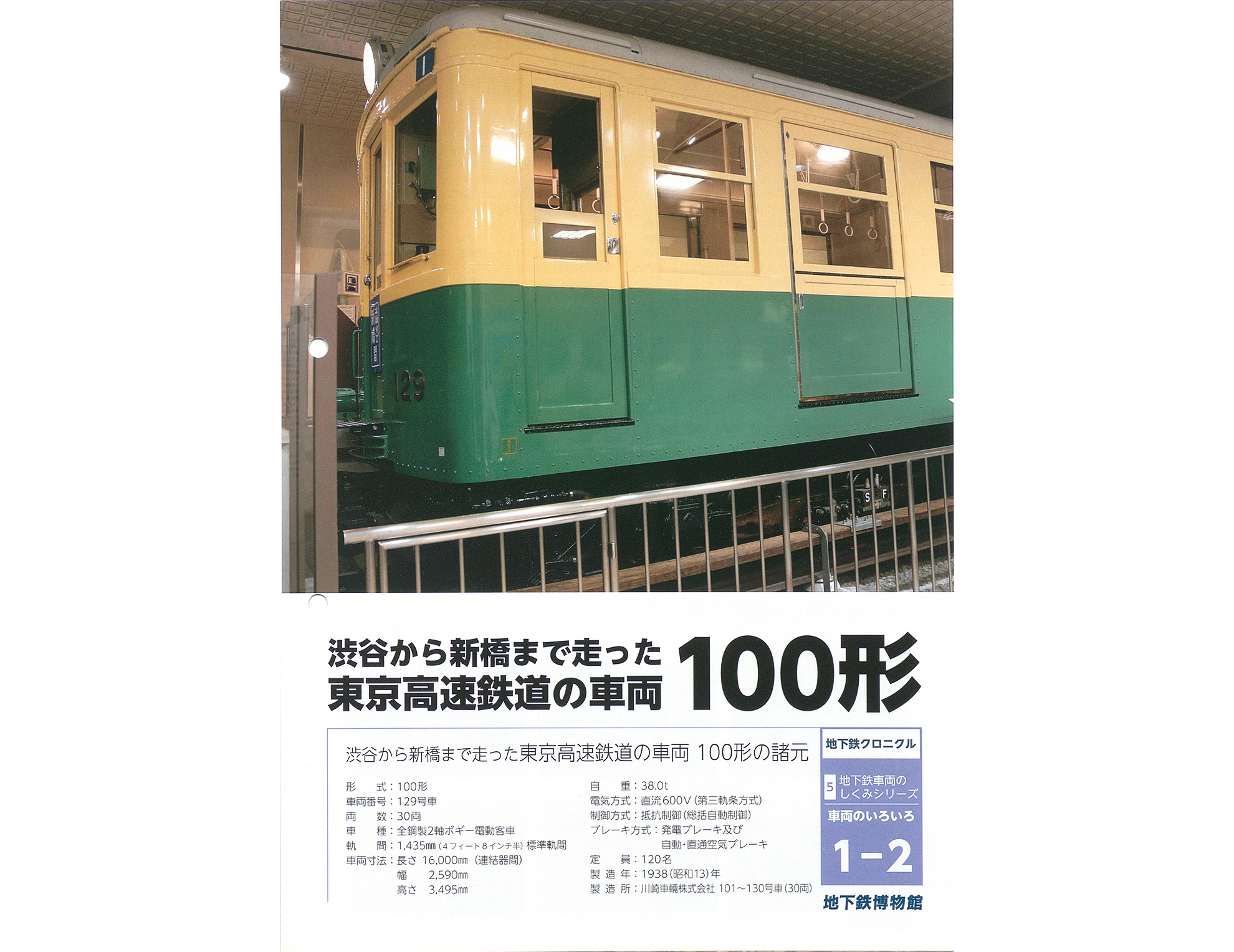 この100形車両は、東京高速鉄道株式会社が渋谷~新橋間の地下鉄開業に備えて1938(昭和13)年に製造した電車です。塗装は上半分が渋い黄色、下半分が濃緑色、屋根の色は銀色と塗り分けられていました。1941(昭和16)年に営団地下鉄となった後はオレンジに塗られて銀座線で活躍しました。